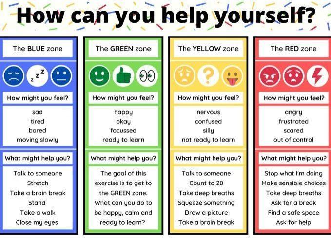 Children will learn that there will be times when they will be in the blue, yellow or red zones. They will be reassured that we all feel like this and it is ok to feel that way.
